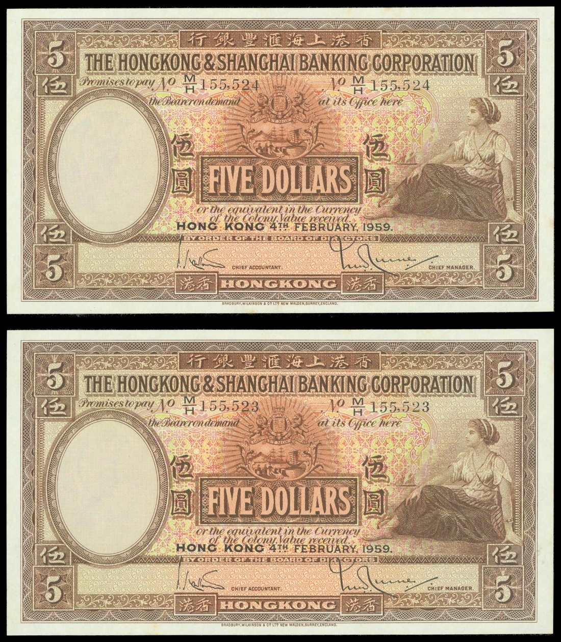 The HongKong and Shanghai Banking Corporation, consecutive pair of $5, 1959, serial number M/H 155523 - 524, brown and multicoloured, reclining maiden at right, coat of arms at centre and watermark of Minerva at left, reverse brown, old HSBC building at centre,