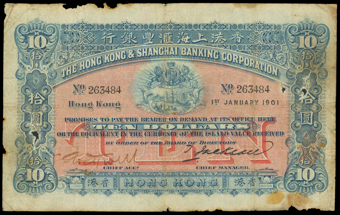 The HongKong and Shanghai Banking Corporation, $10, 1901, serial number 263484, blue and pink-red, arms top centre, value in underprint low centre, and value at each corner, Thomas Jackson signature low right, reverse red, maiden with spear at centre,