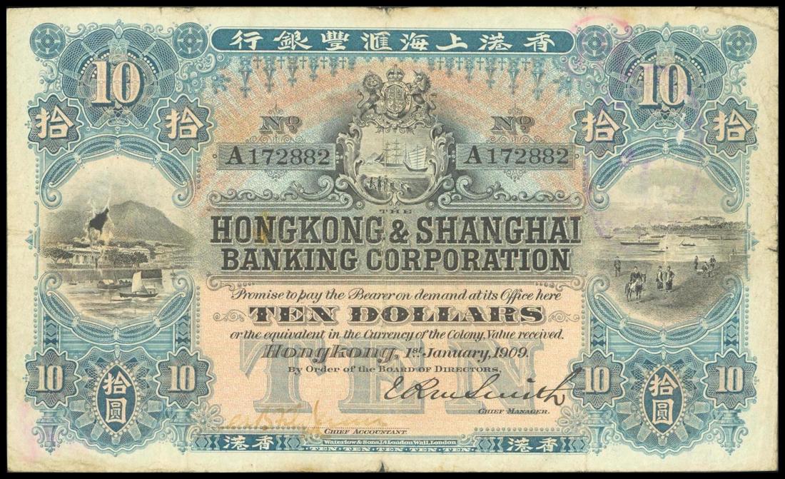 The HongKong and Shanghai Banking Corporation, $10, 1909, serial number A172882, blue on red underprint, waterfront at left, horseman and walkers at right, handsigned signature at bottom, reverse red and black, HSBC building at centre,