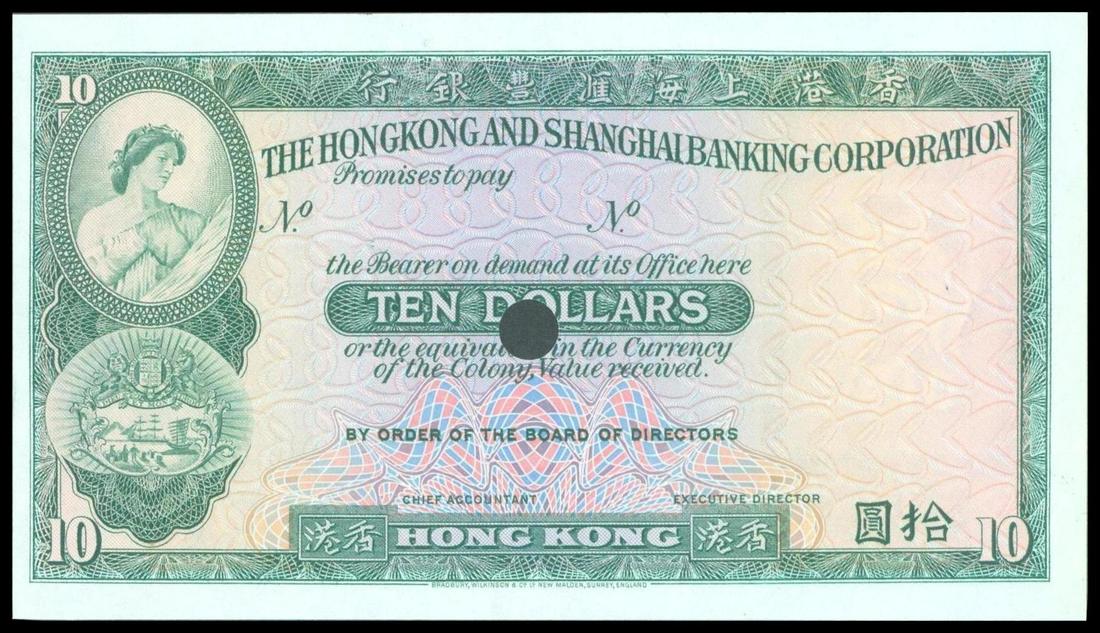 Hong Kong And Shanghai Banking Corporation, proof $10, ND( issued from 1959-1983), no serial numbers, dark green on multicolour underprint, maiden at top left, arms below, reverse green, old bank building at centre,