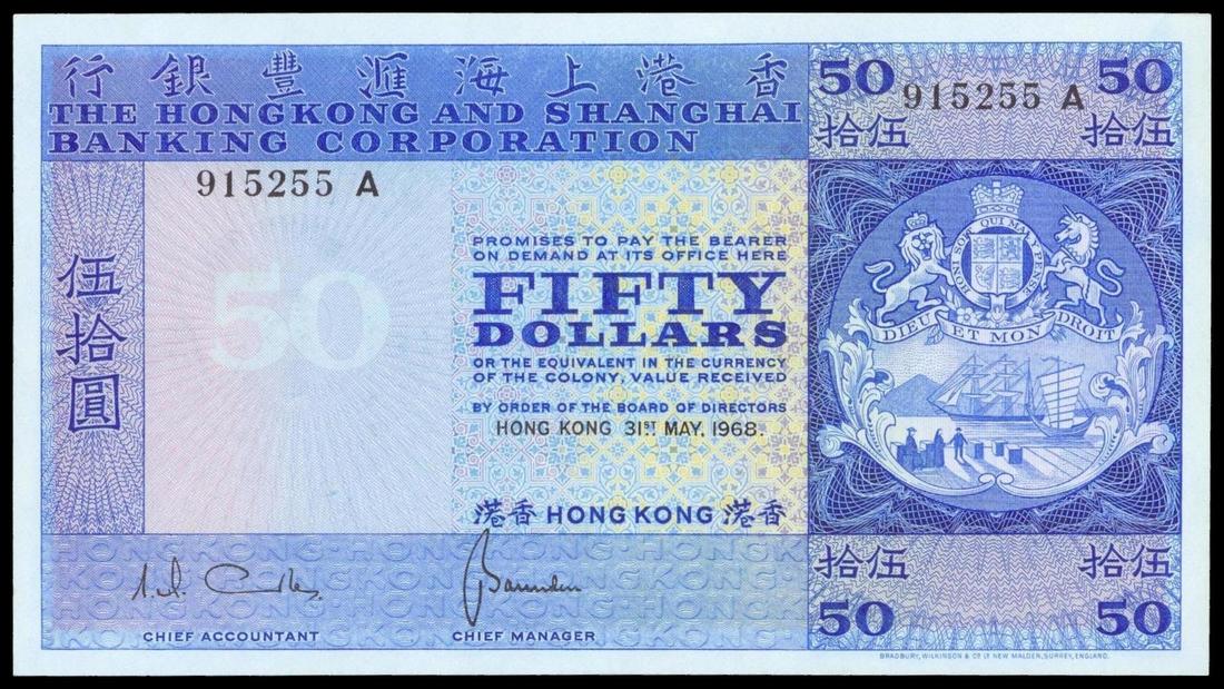 The HongKong and Shanghai Banking Corporation, $50, 1968, serial number 915255A, blue, bank coat of arms at right, watermark of a helmeted warrior at left, reverse blue, old HSBC building,
