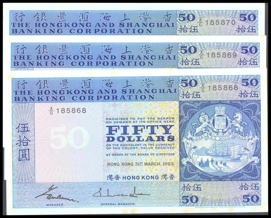 The HongKong and Shanghai Banking Corporation, consecutive trio of $50, 1983, serial number A/6 185868-870, blue on pink underprint, bank coat of arms at right,