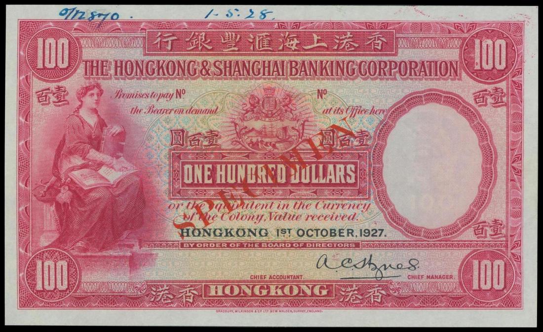 The HongKong and Shanghai Banking Corporation, $100, 'Specimen', 1927, red and multicoloured, Justitia at left, coat of arms centrally and watermark of Minerva at left, reverse red, old HSBC building at centre,