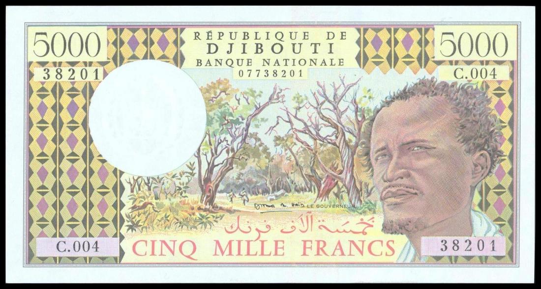 Djibouti, 5000 francs, ND(1979), serial number C.004 38201, multicolour, man at right, forest scene at centre, reverse multicolour, aerial view at centre,