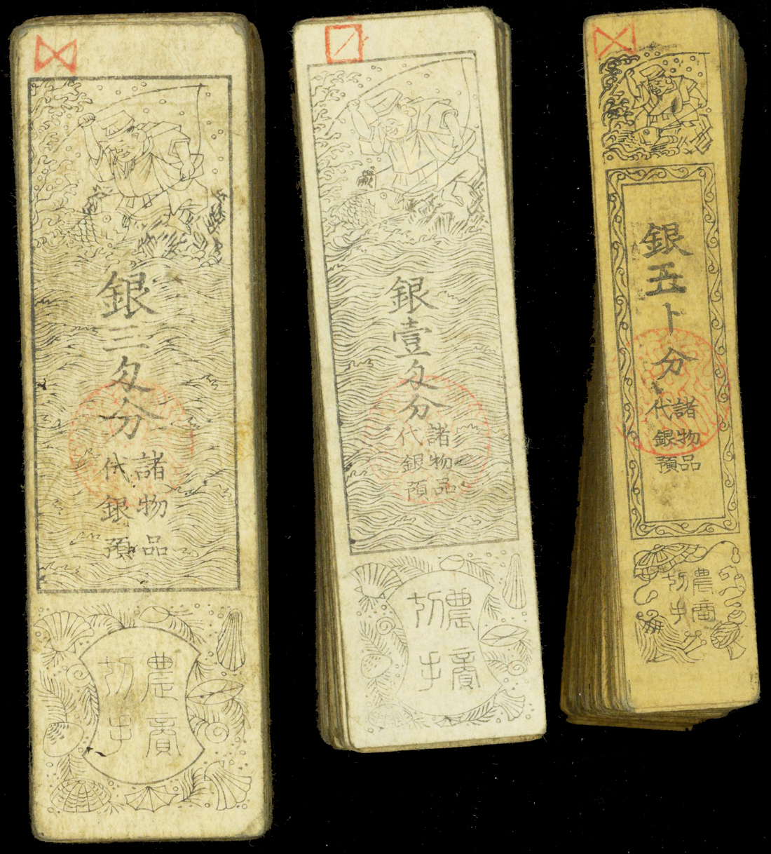 Japan, a lot of approximately 300 feudal notes( Hansatsu), 5 bu, 1 and 3 monme, Year 2 of Meiji(1869), vertical format, black on white, fishing at top,