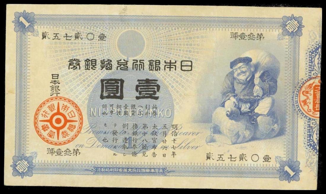 Bank of Japan, 1 Yen, No date(1885), serial number 102752, blue, Daikoku at right sitting on rice bales, reverse orange vignette stating bank name and denomination,