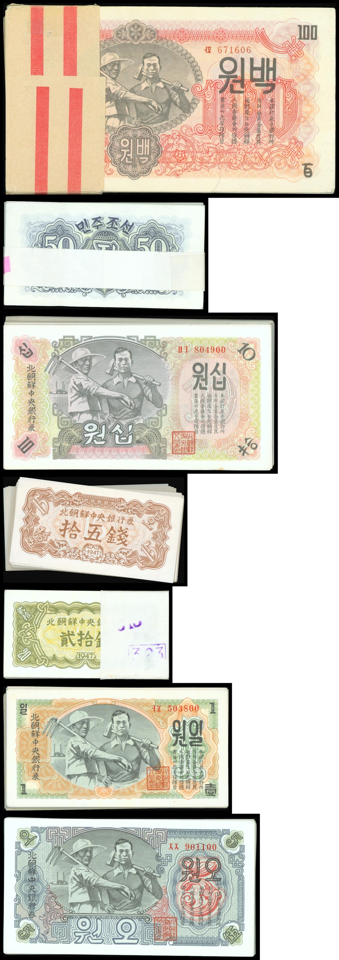 North Korea Central Bank, 15 chon, 20 chon, 50 chon, 1 won, 5 won, 10 won and 100 won, all consecutive run of 100, 1947, original issue with watermark,