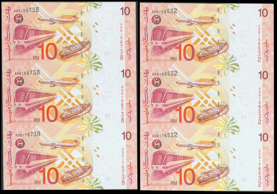Malaysia, 2 x presentation folders of uncut block of 3 in 1 x 10 ringgit,(2), 1997, with same prefix AD and last 4 serial number 6532 and 6738, orange on multicolour underprint,