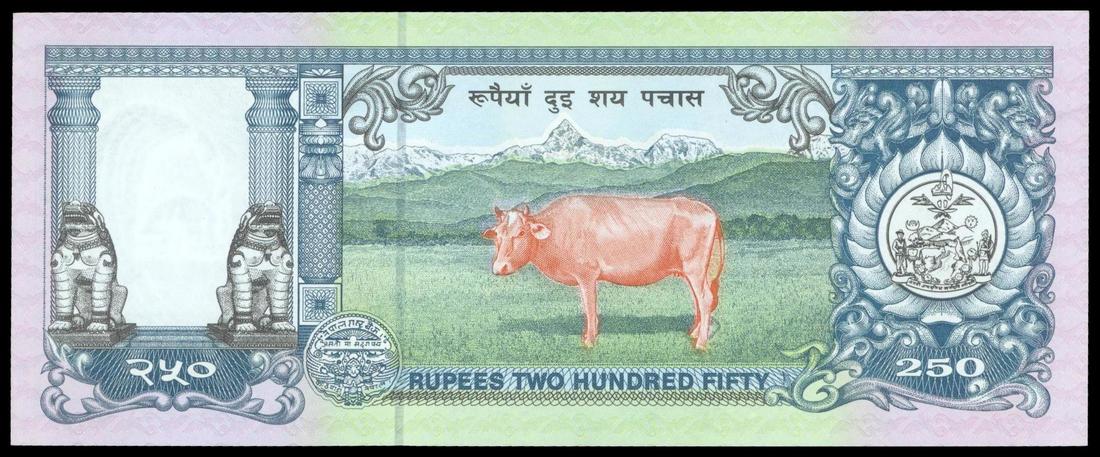 Nepal, 250 Rupees, 1997 Commemorative Issue, dark gray and blue-gray on multicolour underprint, royal palace at centre, reverse black blue and orange on green underprint, ox at centre,