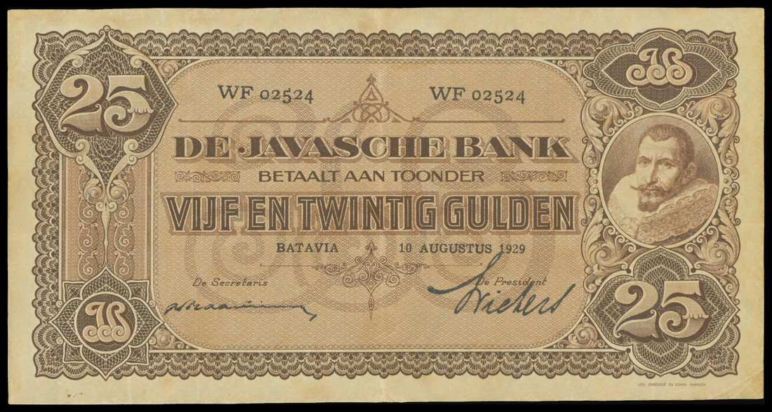 Netherlands Indies, De Javasche Bank, 25 Gulden, 1929, serial number WF 02524, brown, Portrait with ruffled collar at right, reverse brown and purple, building at centre,