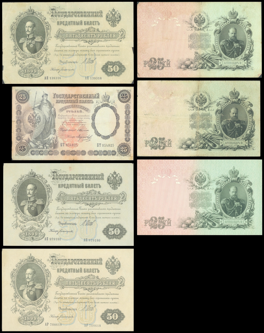 Russia, 7 x State Credit Notes, 25, 50 rubles(3), 1899, 25 rubles(3), 1909, lilac, black, black on red and blue underprint respectively,