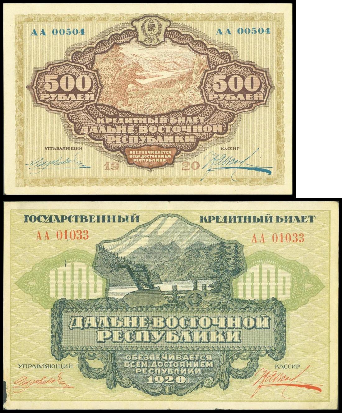 Russia, Far Eastern Republic, 1920 2nd Credit Note Issue, 500 rubles, serial number AA 00504 and 1920 Government Credit Note Issue 1000 rubles, serial number AA 01033, brown on tan underprint and black-green on green underprint respectively,
