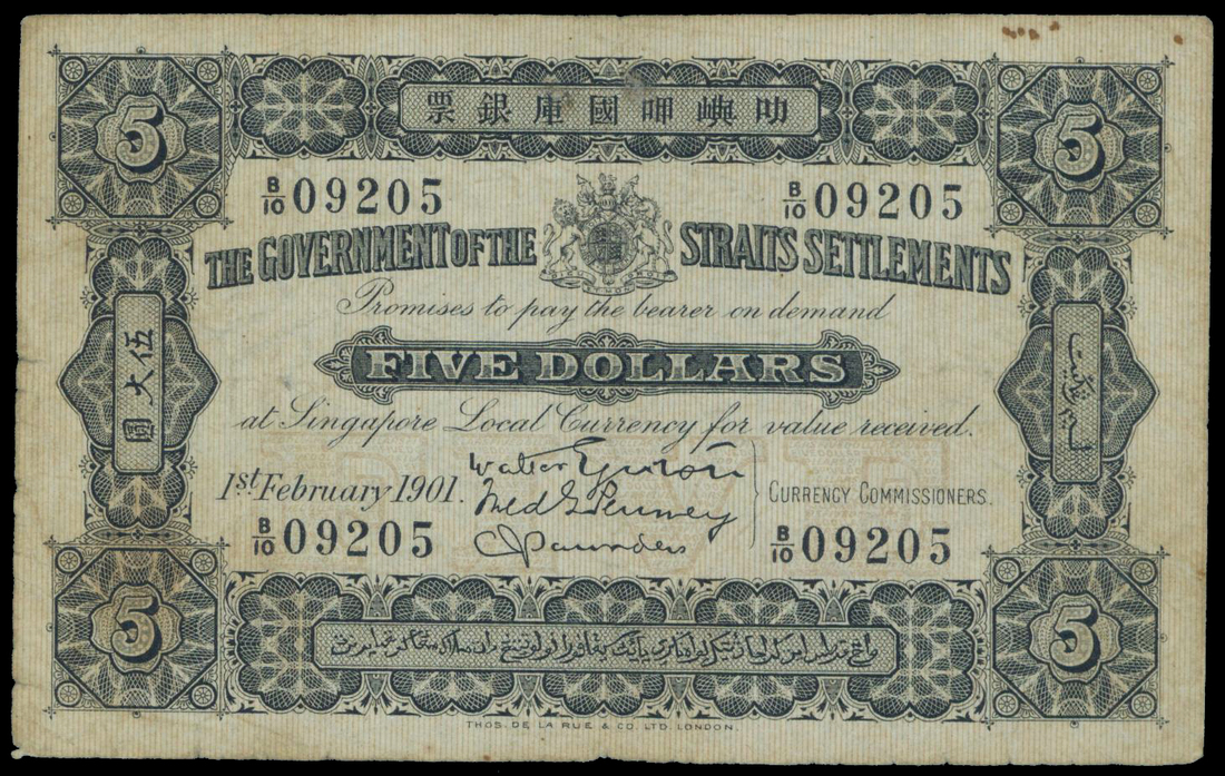 Straits Settlements, 5 dollars, 1901, serial number B/10 09205, black, arms at top centre,reverse dark purple, tiger at centre,