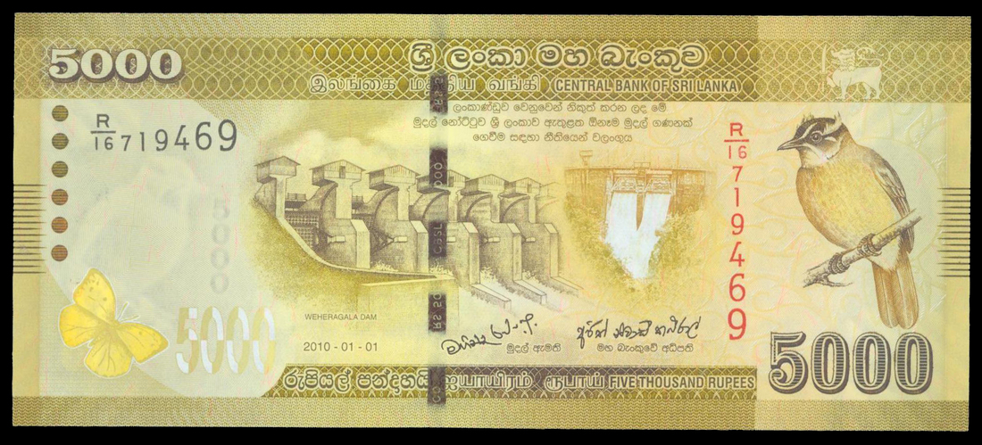 Sri Lanka, 5000 rupees, 2010, serial number R/16 719469, olive-gray and yellow, bird at right, Weheragala Dam at centre, reverse vertical print, multicolour,
