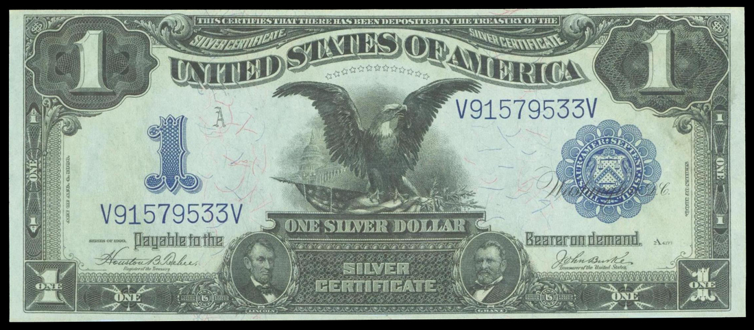 USA, Silver Certificate, $1, 1899, serial number V91579533V, black and blue, eagle with flag above Abraham Lincoln at left and Ulysses S. Grant at centre right, blue seal, reverse green, value,