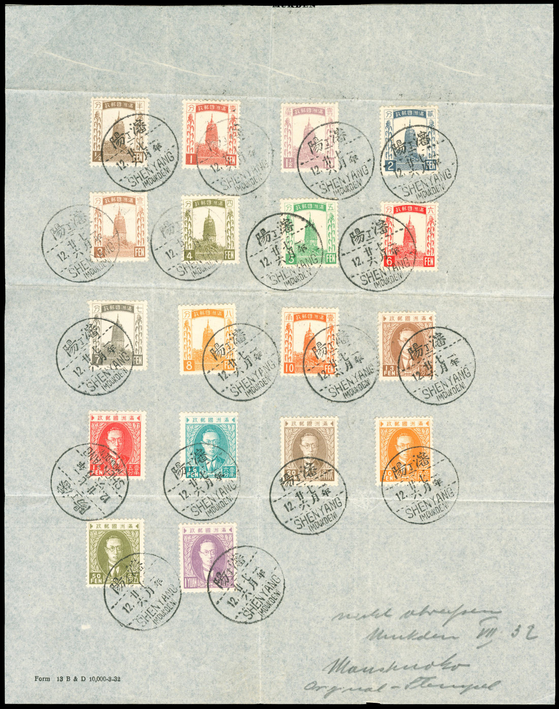 1932 (26 July) First Regular Issue, ½f. to 1y., set of eighteen on page, tied by bilingual "SHENYANG" first day cancelled. Very fine. Chan MK1-18