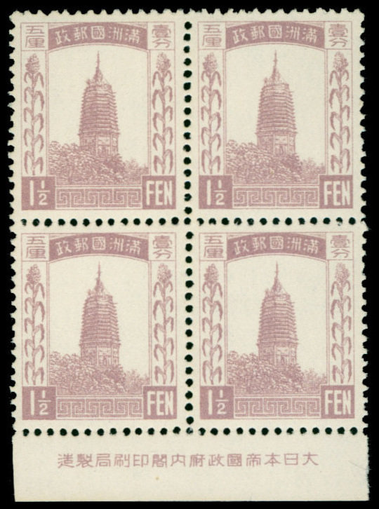 1932 First Regular Issue, ½F., 1F., 1½F., block of four with lower imprint margin, mint hinged on top 2 stamps, origianal gum, very fine.