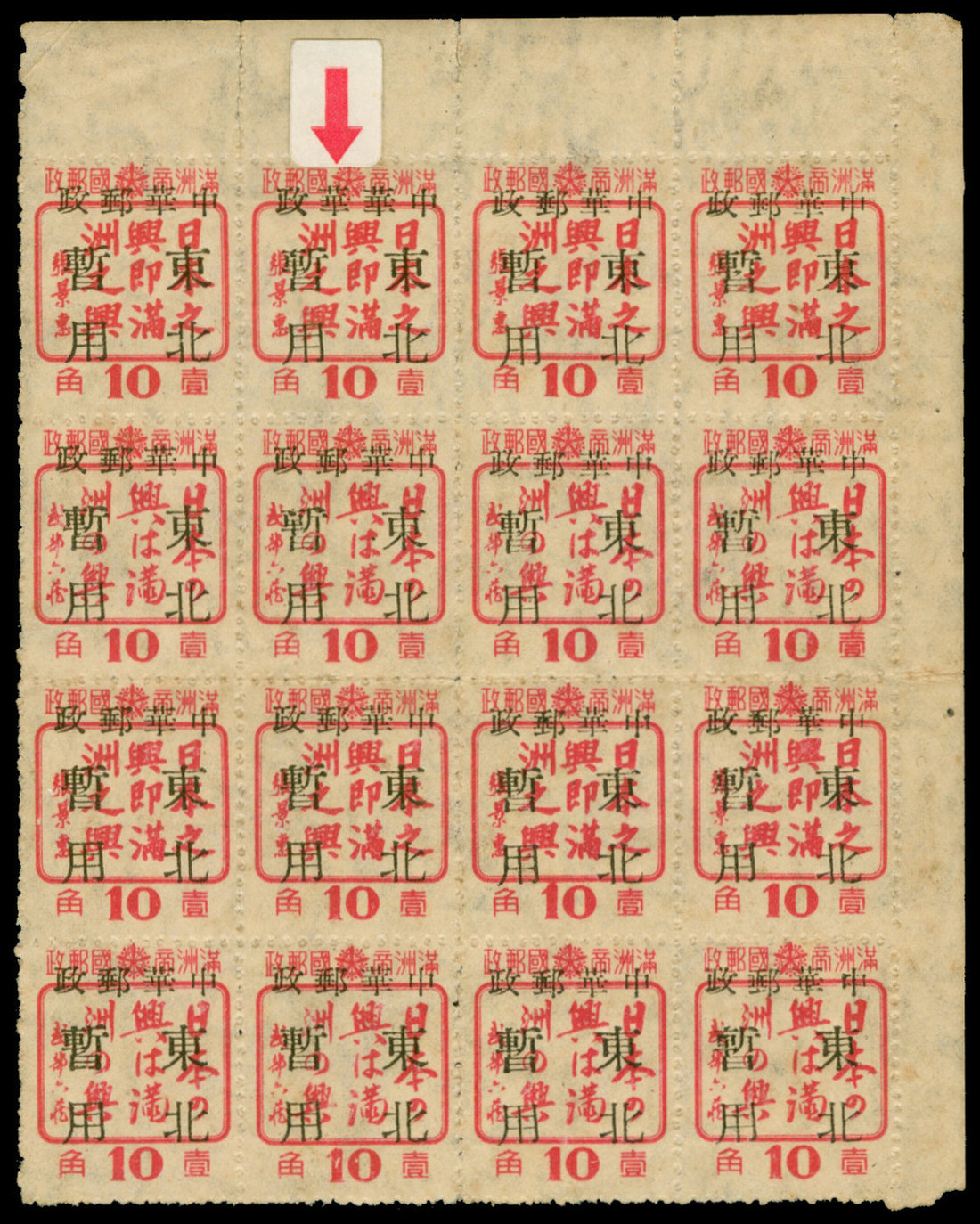 1945 Propaganda for Japan and Manchukuo opt. 'Temporarily used for North East' 10c. upper right corner block of sixteen, one stamp with character 'Hua' for 'You' error, good to fine.