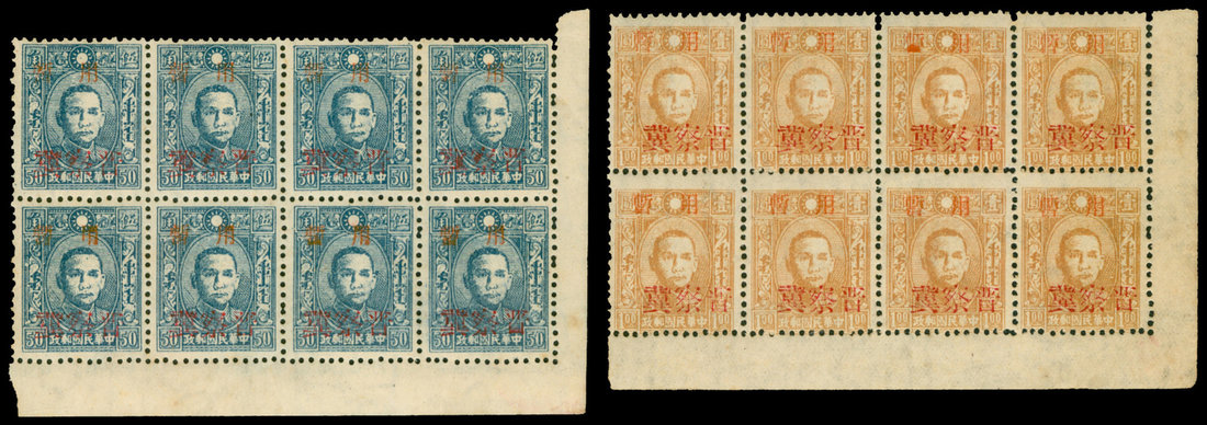 1945 Machine opt. on Sun Yat Sen characters and temporarily used for Chin-Cha-Ki 50c. and $1, lower right corner block of eight, unmounted mint, fine. Yang NC13-14.