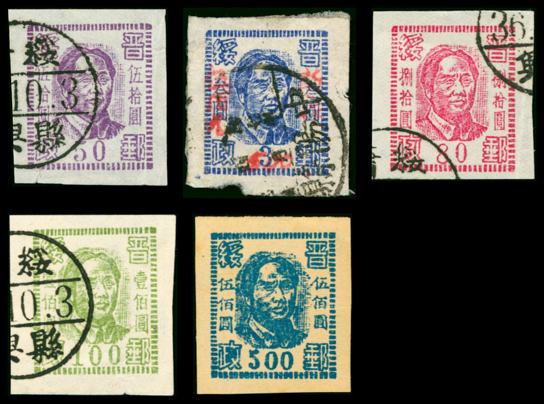 1946-48 Chin Sui Border area, Chairman Mao, 1st print $50, $80, $100 fine used, surcharge on 1st print $500 on $3, postal used, plus 2nd print, $500 blue, unused, very fine. Yang NC 259-261, 263, 275.