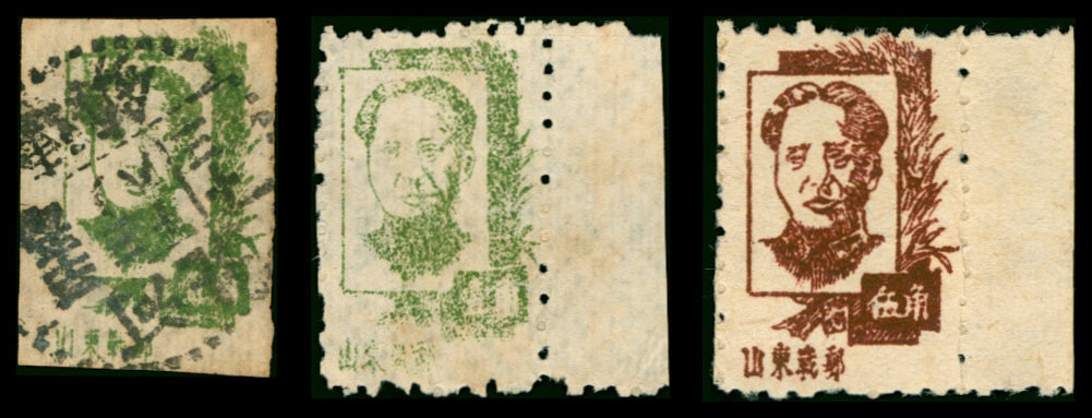 1944 Shantung War Time Post, Chairman Mao, 2nd print, 10c., 50c., rough perf., set of two, unused with right sheet margin, very scarce plus 10c. imperf., postal used. Chan EC24b, 25b, 24.