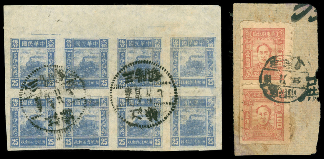 1948 Ching-Chow 2nd Print, Chairman Mao $100 vertical pair on piece, used with hand-written c.d.s. plus 1946 Su-Wan Border area, Train Issue, 25c., block of eight with top margin, imperf., used, very fine. EC147, EC322.
