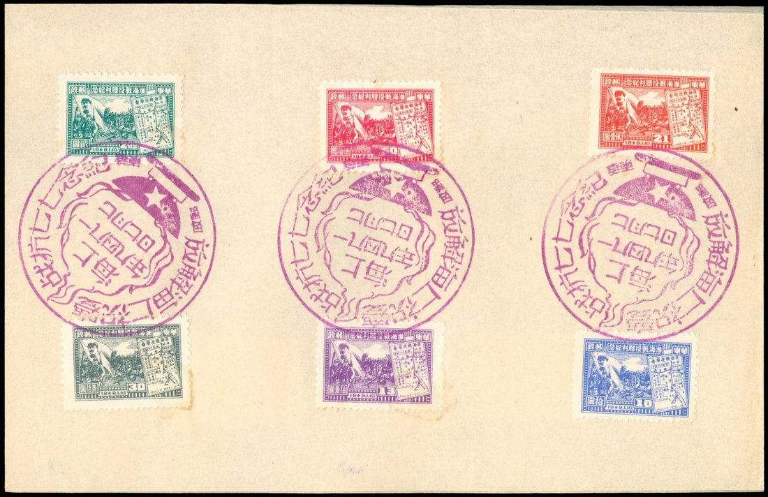 1949 Victory of Hwai-Hai, complete set of eleven, Tientsin Print, Train and Postal Runner, complete set of eleven, both on pages tied by violet, commemorative chops.