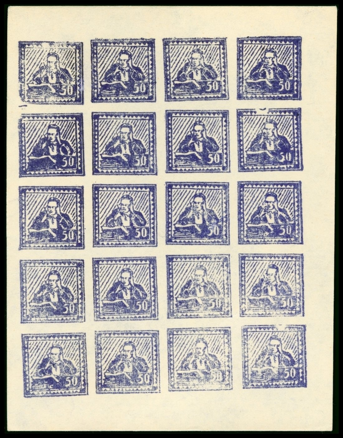 1949 Yili-Tacheng-Astao Area, worker design, $50 blue, sheet of 20, unused, very fine. Yang 103.