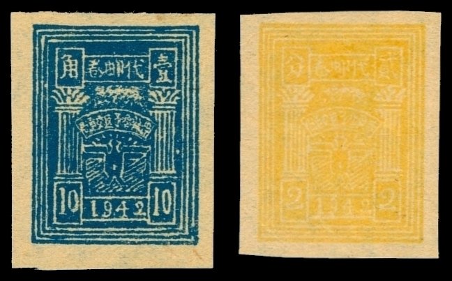 1942 Chin-Ki-Lu-Yu 2c. Yellow, 10c. deep blue unused, Yang NC156,158.