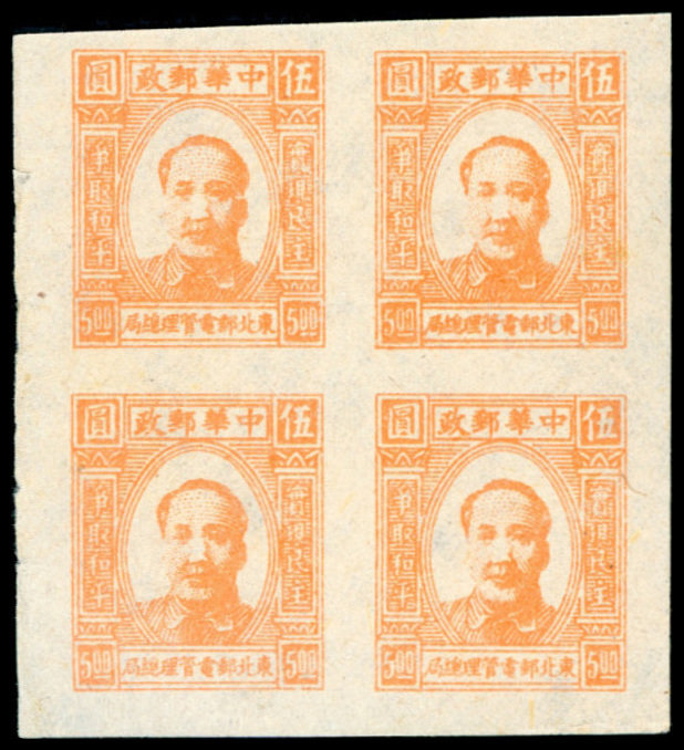 1946 Chairman Mao, 1st print, imperforated $2, $5 and $10 block of four, unused, very fine. Yang NE6-8