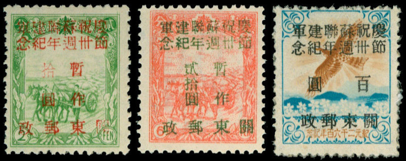 1948 Red Army Day $10 on 2f. to $100 on label set of three, mint. Yang AD32-34; S.G. NE39-41, £1925. Photo