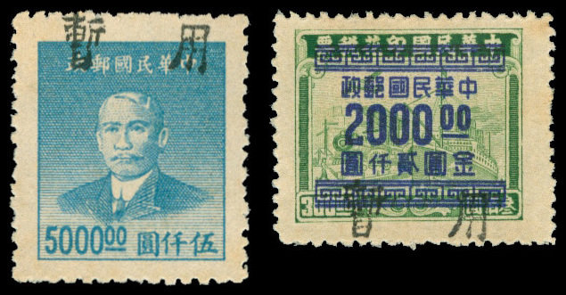 1949 Yu-Kiang handstamped on Sun Yat Sen and revenue stamp with 'Temporary Use' in black $2,000 on $300 green, $5,000 turquoine blue, set of two, unused, very fine. Yang LCC27, 28.