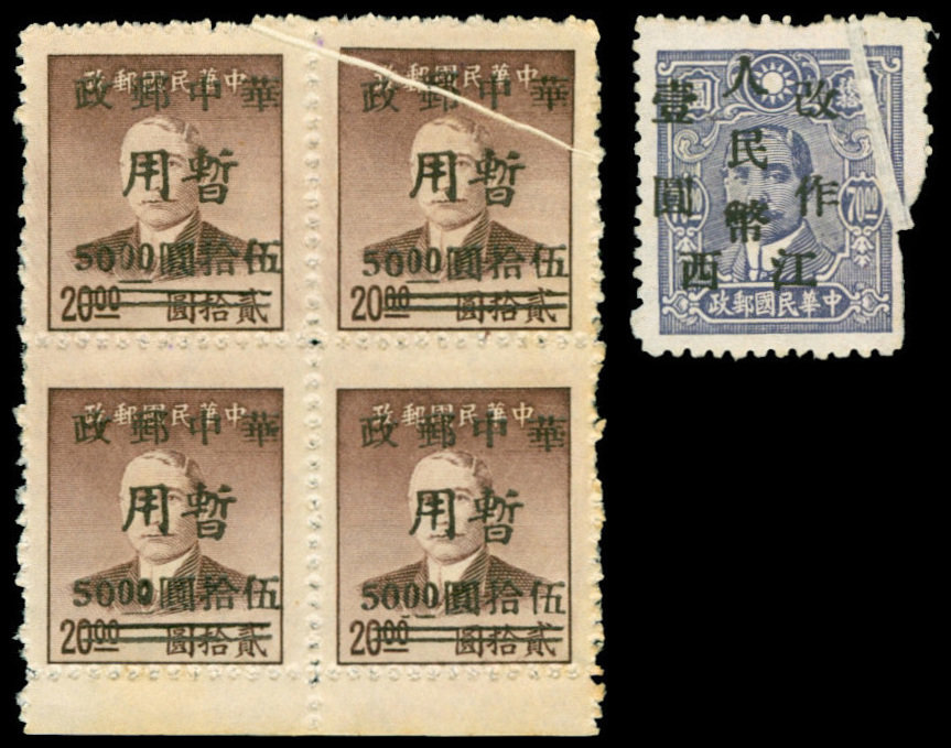 4 items of paper folded varieties including 1949 Hankow surcharge $50 on $20 block of four, Tientsin print, Train and Postal Runner block of four, Peking surcharge 'Temporary Use for $10 and Nanchang surcharge $1 on $70, unused, very fine. Yang CC58, EC409, NC399, CC167.