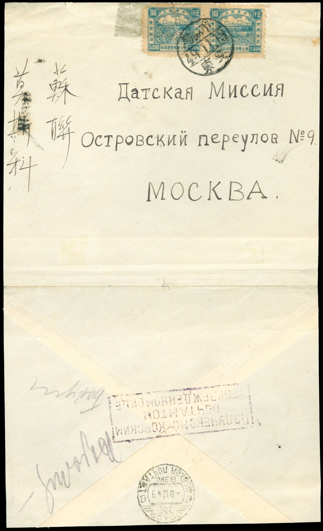 1949 (13 NOV) cover from Andong to USSR bearing NE139 pair tied by Andong c.d.s. Moscow (8 DEC) arrival c.d.s..