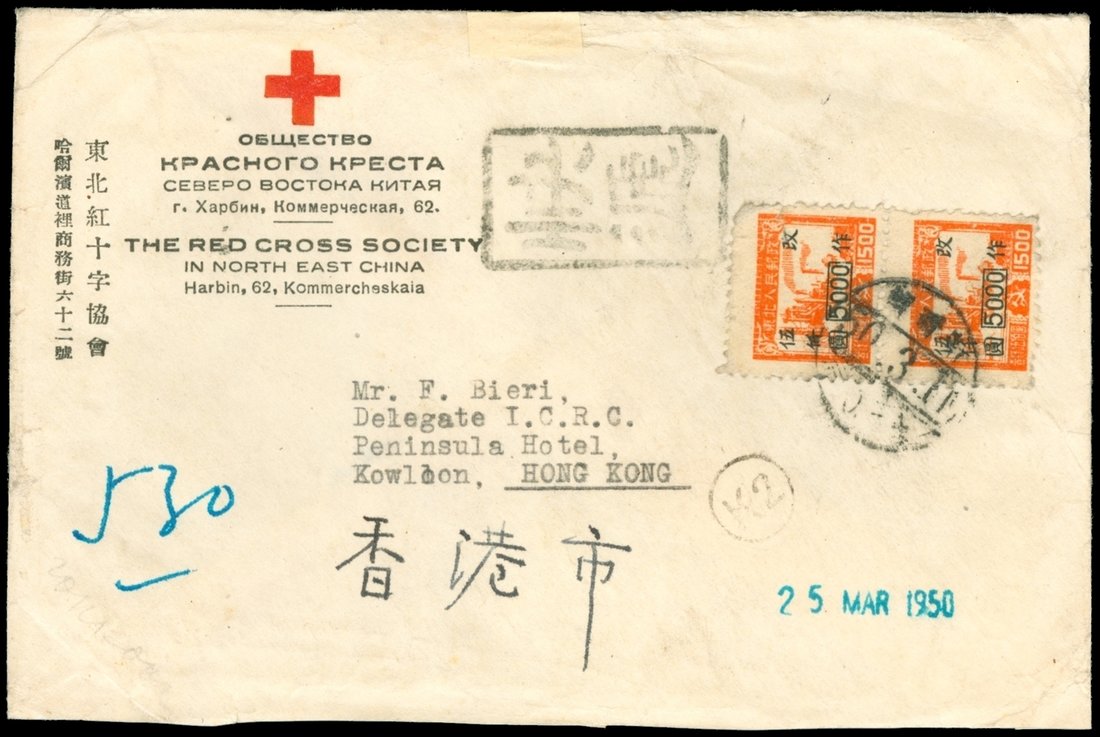 1950 (11 MAR) Express cover from Harbin to Hong Kong, domestic letter rate of $5,000, and Express rate of $5,000 for total $10,000.