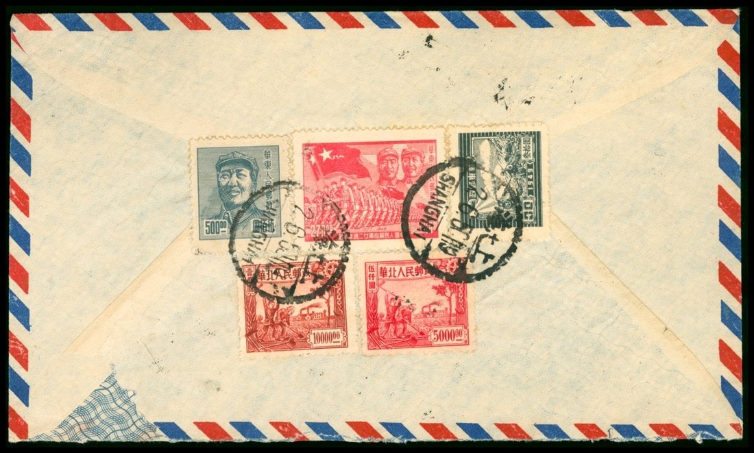 1950 (2 JUN) an air mail cover from Shanghai to U.S.A. total rate $15,850.