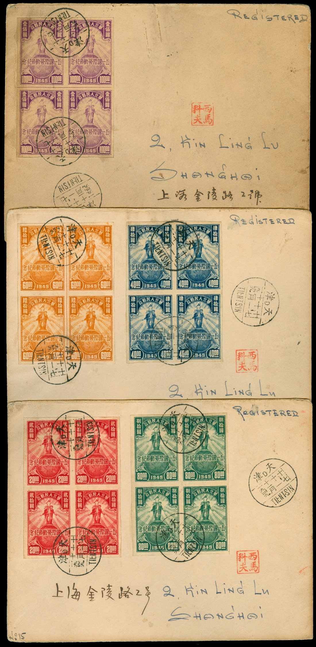 1949 (11/11) Central China Labour Day imperf sets in block of four on three registered covers Tientsin to Shanghai.