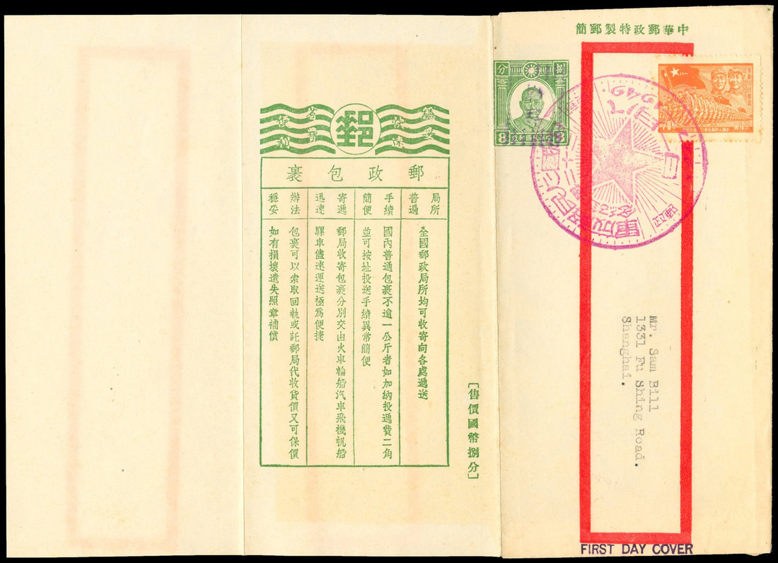 1949 (8/1) $70 Central China issue FDC used in Shanghai, overfranked Sun Yat Sen letter stationery with 8c. stamp printing shifted error.