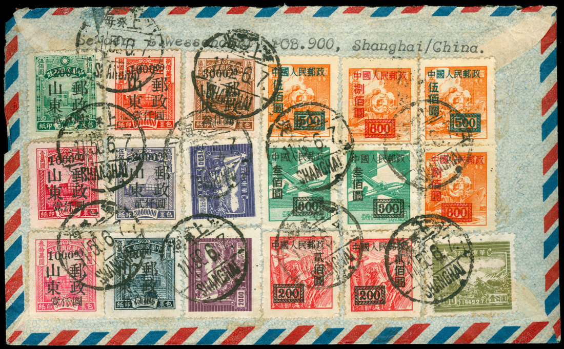 1950 (6/7) Multiple combination franking airmail Shanghai to Germany, including liberated area Shantung surcharges, Silver Yuan Szechwan surcharges etc.