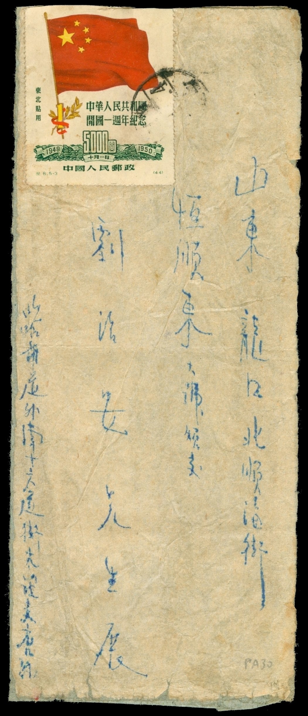 1951 NEC6 $5000 single franking cover Harbin to Lungkow, Shantung.