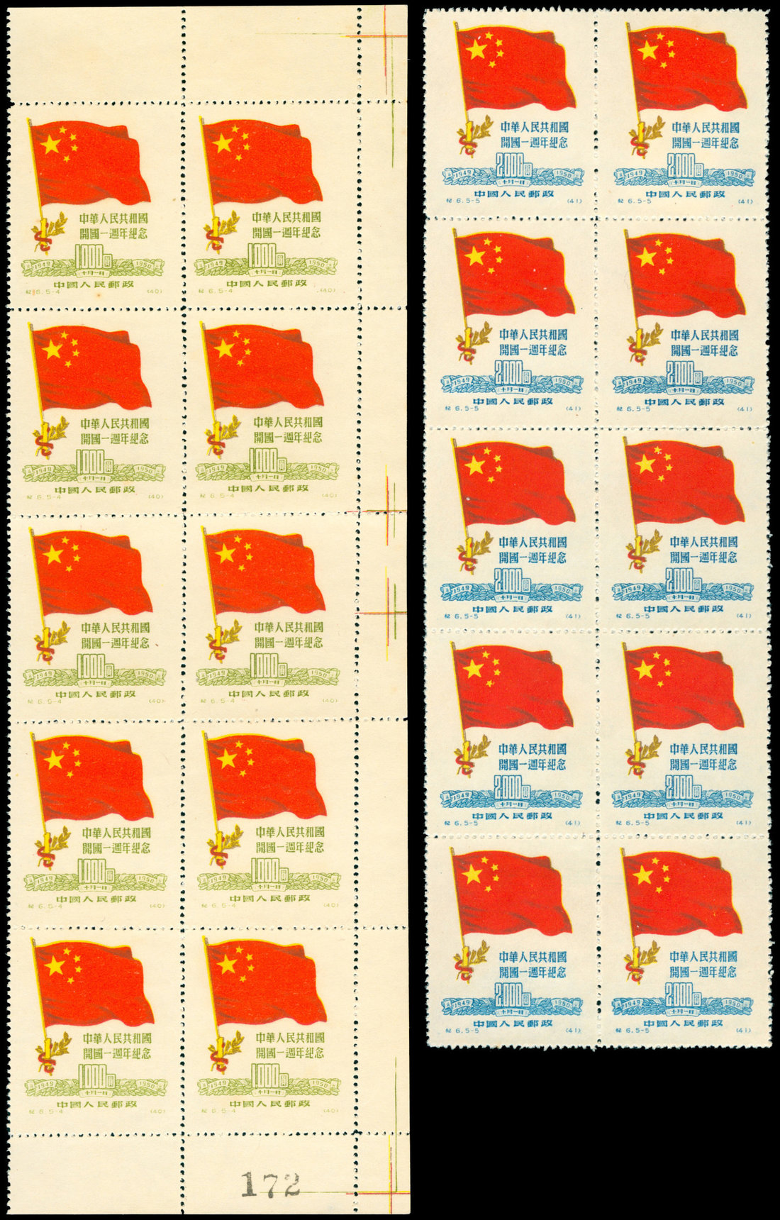 1950 C6 First Anniversary of People Republic of China, block of ten, original set of five, unused, very fine. SG1464-1468.