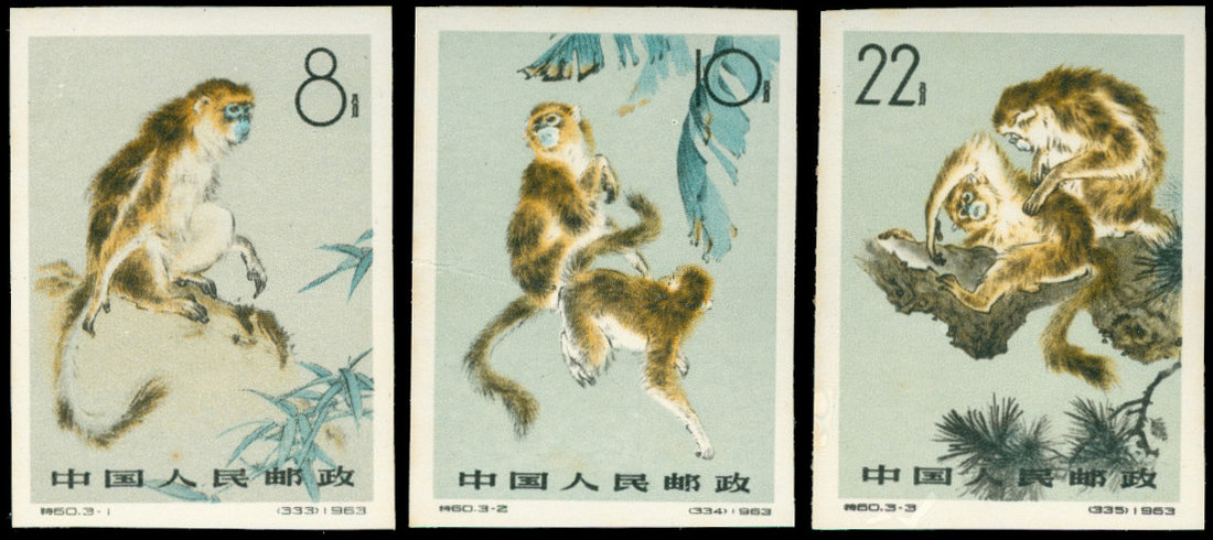 1963 S60i Snub-nosed Monkeys, set of three, imperf. Light toned. SG 2122i-2123i