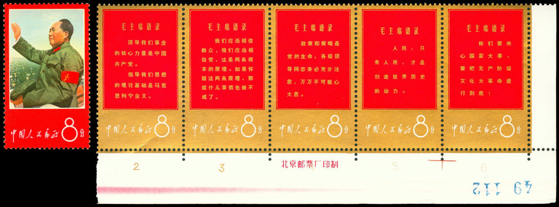 1967 W1 Thoughts of Mao, two se-tenant strips of five with lower imprint margin, gold, unmounted mint, set of 11. Very fresh.