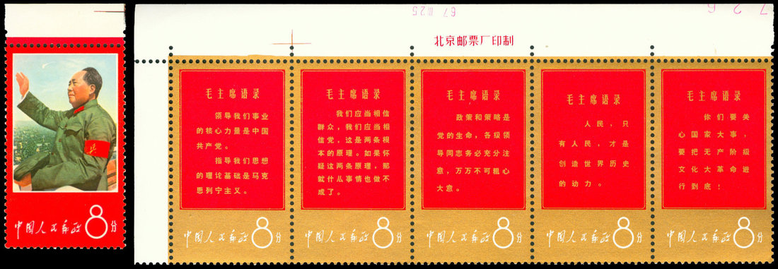 1967 W1 Thoughts of Mao, two se-tenant strips of five with upper imprint margin, gold, unmounted mint, set of 11. Very fresh.