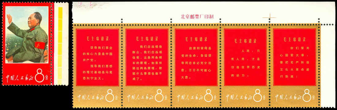 1967 W1 Thoughts of Mao, two se-tenant strips of five with upper imprint margin, gold, unmounted mint, set of 11. Very fresh.
