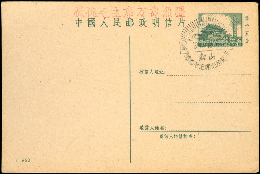 1974 Tien An Man 4f. Postcard with Home of Chairman Mao commemorative chop, scarce.