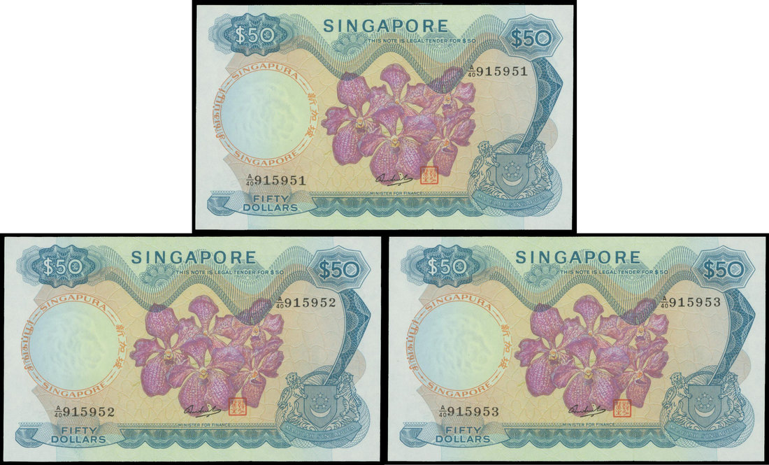Singapore, consecutive trio of $50, serial numbers A/40 915951 to 915953, the famous 'Orchid' series, blue and dark pink, harbourside scene on reverse,