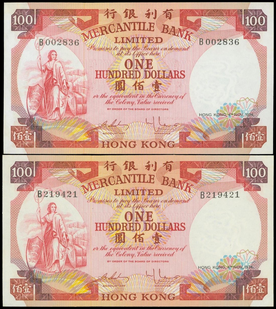 Mercantile Bank, lot of 2x $100, 4.11.1974, serial numbers B002836 and B219421, red and multicolour, Britannia holding a spear at left, reverse blue and red, view of Victoria Harbour,