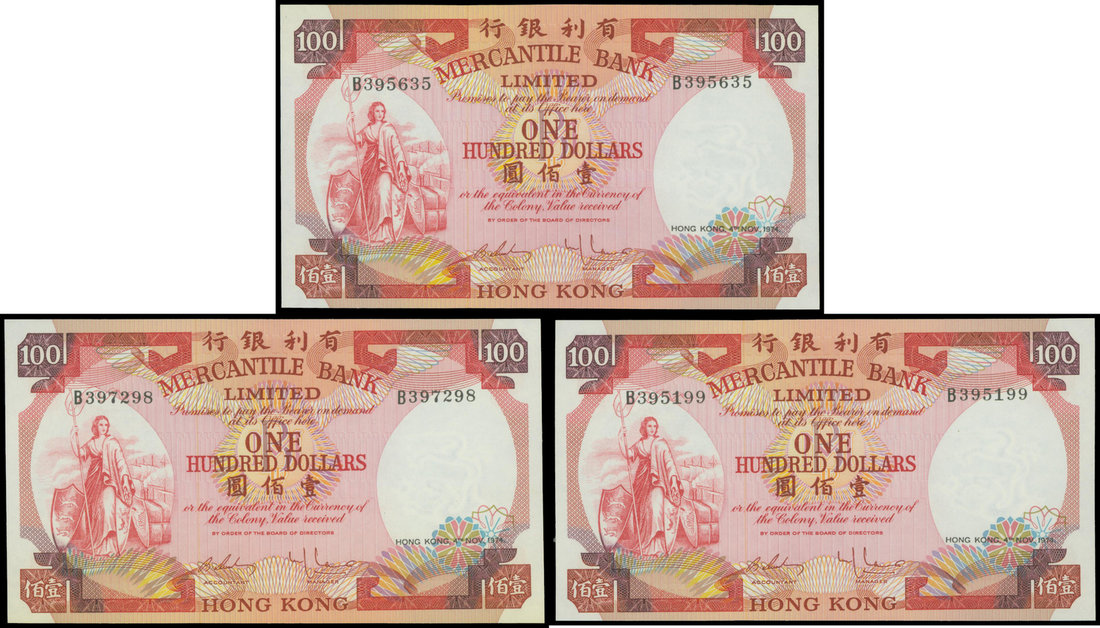 Mercantile Bank Limited, a group of 3x $100, 4.11.1974, serial numbers B395199, B395635 and B397298, red and multicolour, Britannia holding a spear at left, reverse blue and red, view of Victoria Harbour,