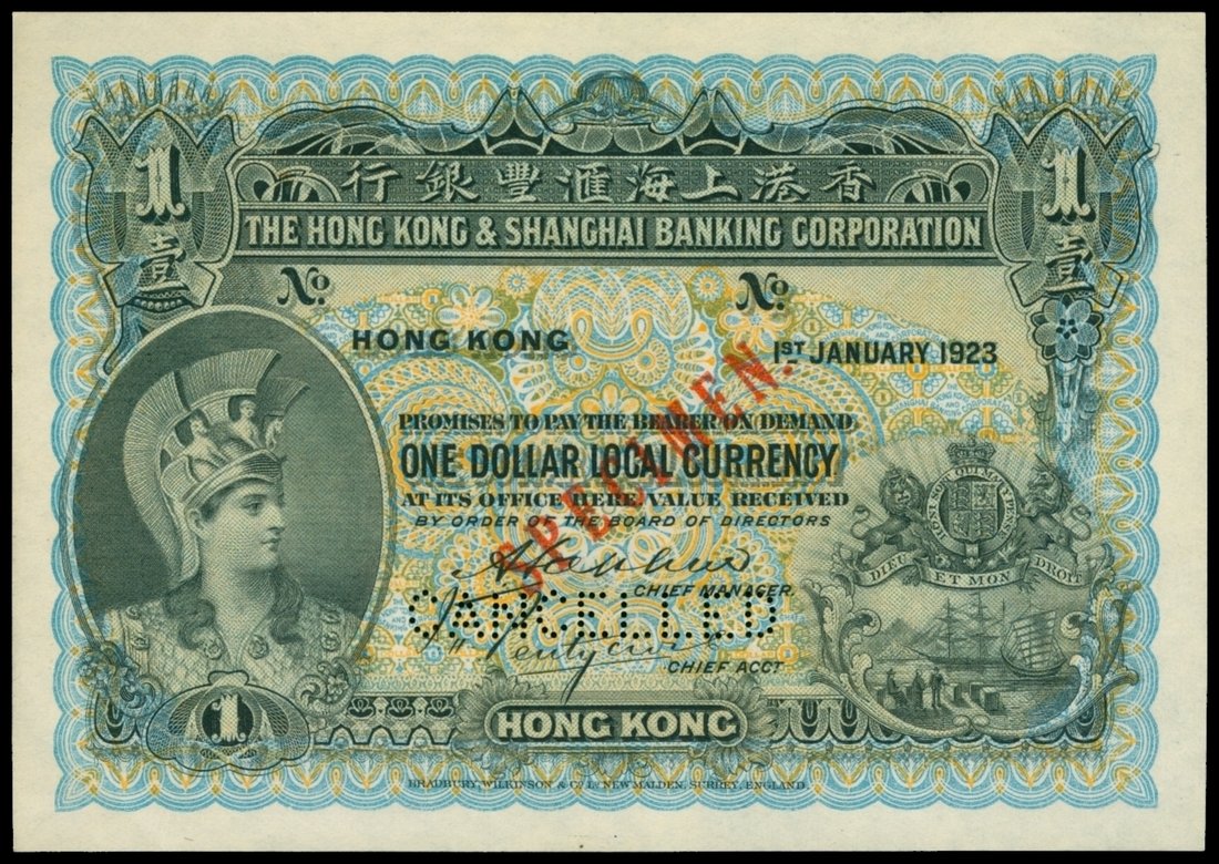 The HongKong and Shanghai Banking Corporation, $1. specimen, 1.1.1923, without serial numbers, blue and multicoloured, helmeted head of Minerva at left, two printed signatures below, reverse purple-pink, maiden with harp centre,